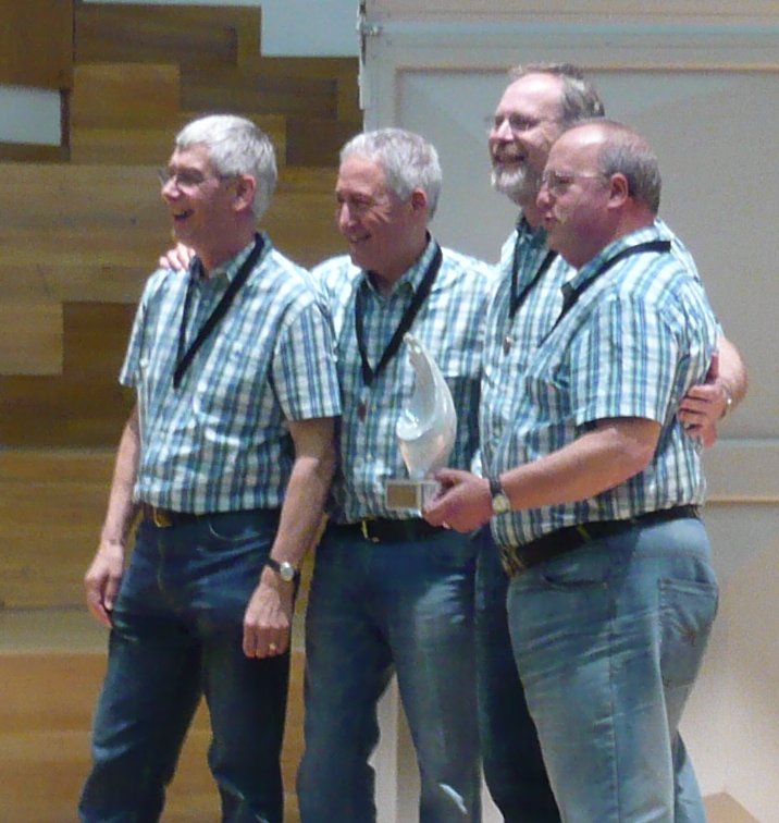 Having talked about the family connections in evidence at last month’s LABBS Convention, I hadn’t thought to go over the same ground here. But I can’t resist mentioning Lads ‘n’ Dads, who fortuitously were drawn to sing last on the day – and thus to the biggest audience. Two years ago, when Monkey Magic had to dash off for an audition, their Youth Quartet trophy was collected by their parents on their behalf. This year, Alan and Duncan sang with their fathers. Given the adventures of the last year – rebranding as the Great British Barbershop Boys, record contract, UK tour – it was a lovely gesture. Nobody had thought that they would forget their roots, but the audience greatly enjoyed the public demonstration that they hadn’t.