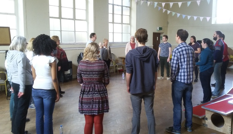 Well, demon exercises disguised at silly games. The toggle principle came into its own as a means to make everyone dig deep for breath (toggling between brrr and vvv), refresh their posture at will (toggling between slumped and aligned), and articulate the text (toggling between crisp and soggy consonants). It was entertaining to observe, in the last of these, what a relief it was to everyone to return to doing something well after an extended period where nobody had toggled them back from the soggy mode.
