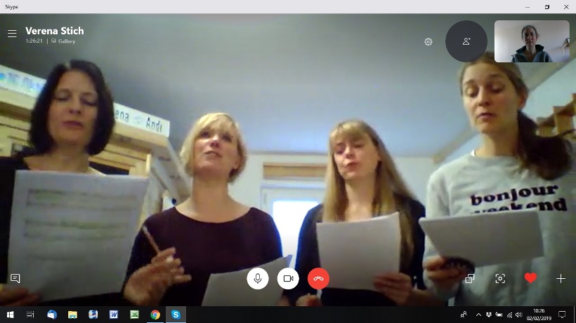Saturday took my musical attention back to Munich, though my body stayed at home. The amenity of Skype allowed me to spend a couple of hours with LaBOOM quartet working on two new songs I arranged for them back in the autumn. They quite sensibly wanted to get this session done early in the learning process, to shape the overall concept of the songs before they’d got too settled in their habits with them.