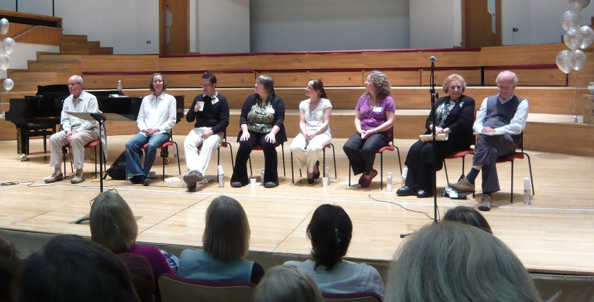 Friday night's panel: Brian Kay, Amy Bebbington, Neil Ferris, Jackie Roxborough, Helen Smith, Rachel Greaves, Pamela Cook and John Rutter