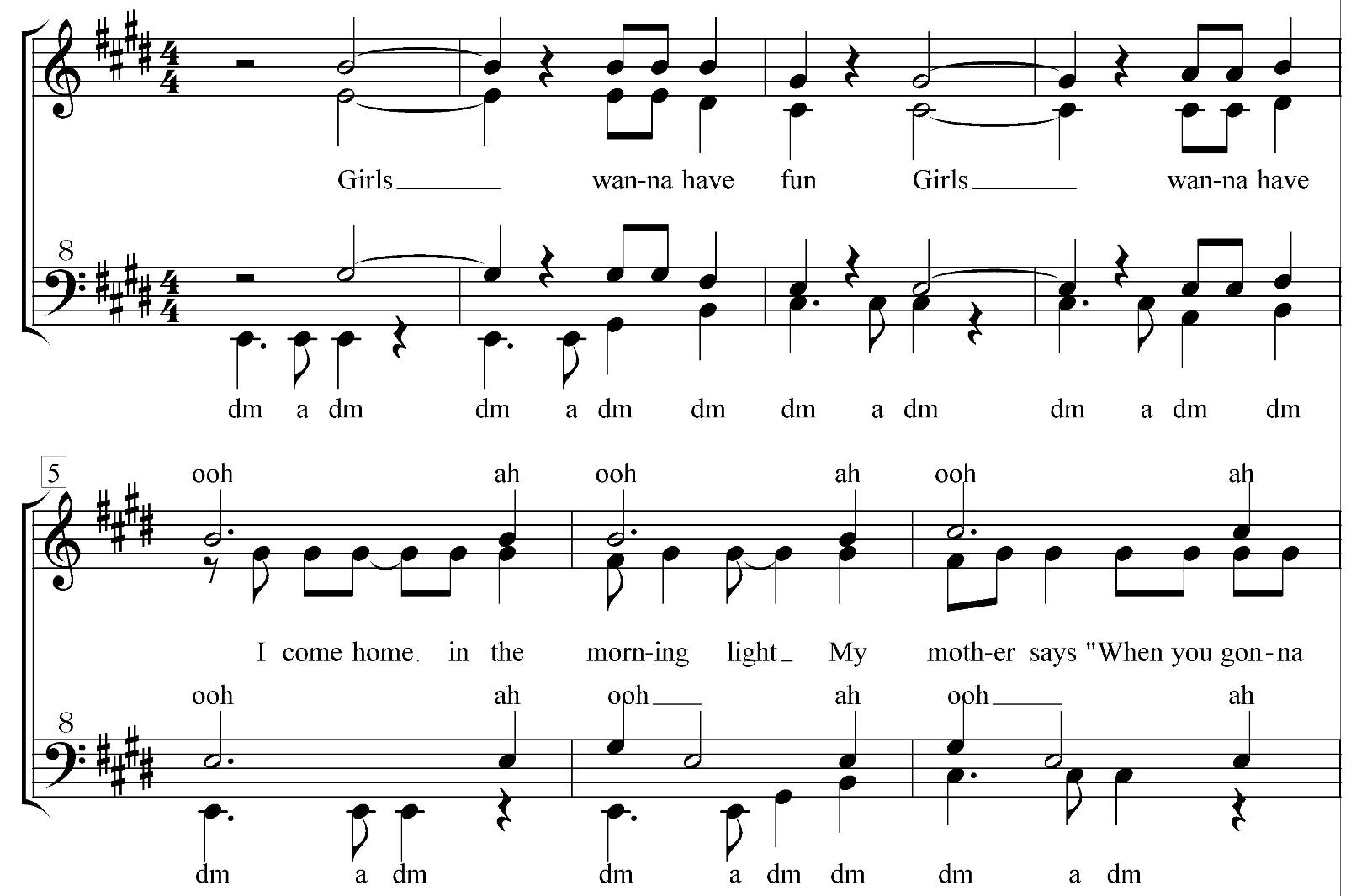 I have so far done four arrangements that are so simple harmonically that they feature not a single sharp or flat. (Diamonds on the Soles of her Shoes is already available; the others will show up over the next year after the groups they were written for come to the end of their exclusivity periods: Valerie, Girls Just Want to Have Fun, and Fields of Gold.) That’s enough to start making some generalisations about what I’ve learned.