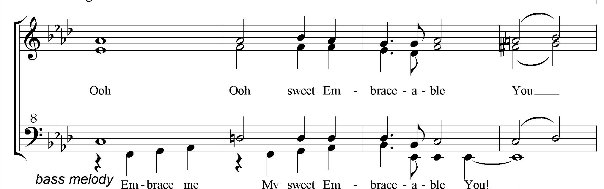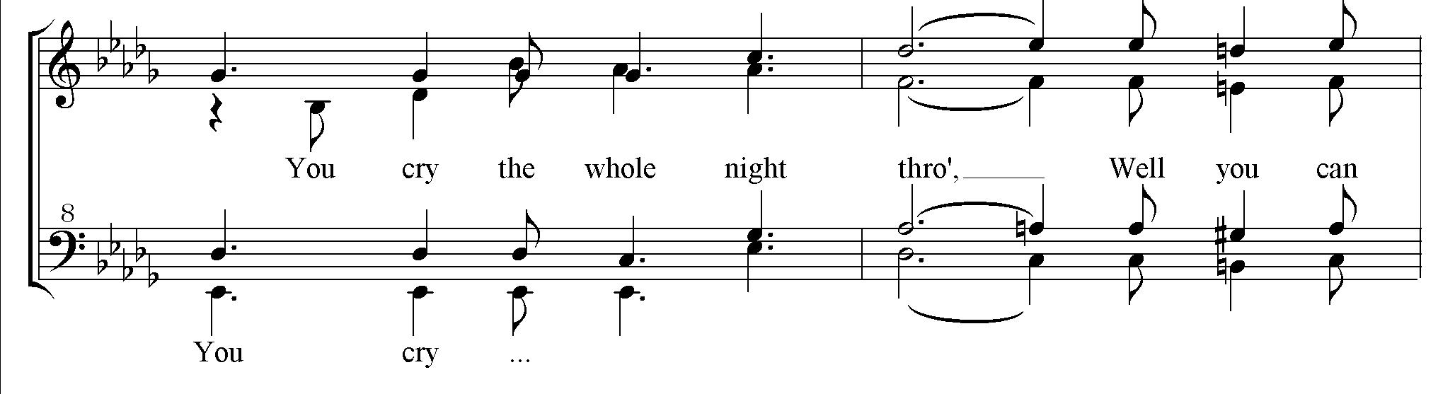 So, in this example from Cry Me a River, the bass has an octave leap, and both tenor and baritone leap up a tritone within the chord of A flat 7 on the words ‘whole night’.