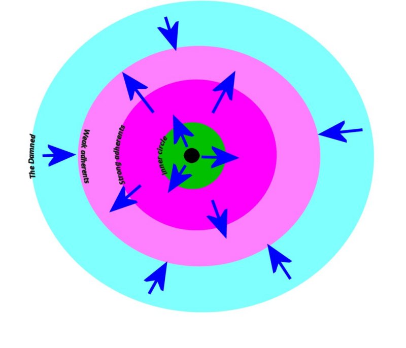 What you find is that the leader collects a core of dedicated followers, an inner circle, who assume a primary responsibility for disseminating the leader's message. You then find a layer of adherents - the faithful, the believers. These may in turn separate out into layers of strong adherents (who go around proselytising to all and sundry) and weak adherents (who go along with things quite happily but don't necessarily seek converts). And then out in the hinterland is everyone else: the benighted, the unenlightened, the lost souls, the damned.