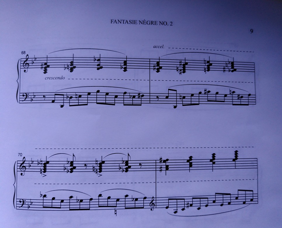 I’ve been thinking about this recently from a dual perspective, as both performer and creator. I’ve been learning Florence Price’s Fantasie Nègre no. 2 in G minor, and finding myself asking all kinds of questions of the score that I probably would not have asked before spending years creating scores for other people to perform. A lot of them are about voicing: why did she choose to include the 7th in a dominant here, but not here? Why are most of the RH diminished 7ths in this passage written as complete handfuls, with a full five notes, but a few with only four?