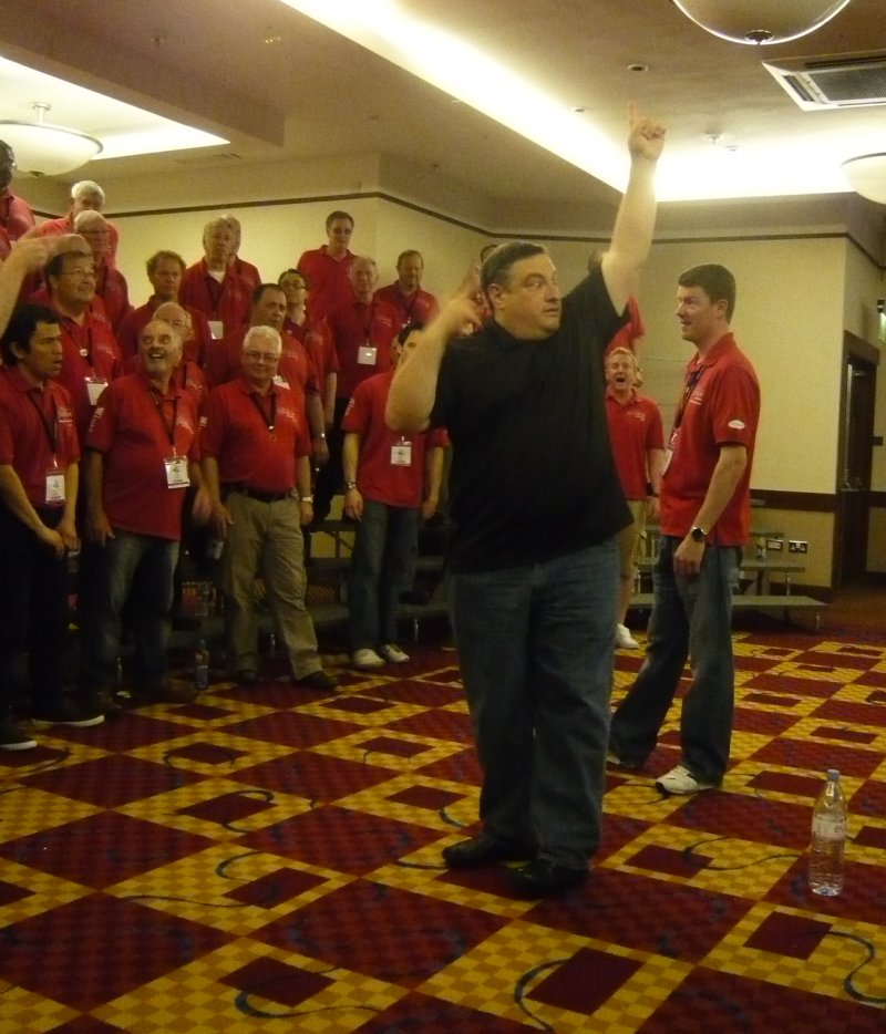 As I noted last time I watched Jim Henry coaching, the how is more striking than the what. The techniques are simple, and Jim has no compunction about staying with a single technique and/or coaching focus for an extended period of time. Indeed, when I asked a friend what I'd missed in the first part of the session (I was late as I needed to hear the Telfordaires premiere an arrangement they had commissioned from me for the 40th anniversary convention), she said, 'He told them to sing in tune'. Which is actually also a fair summary of the hour I saw. Of course, the point is, anyone can tell you to sing in tune - it's the coaches who can make that actually happen you want to pay attention to.