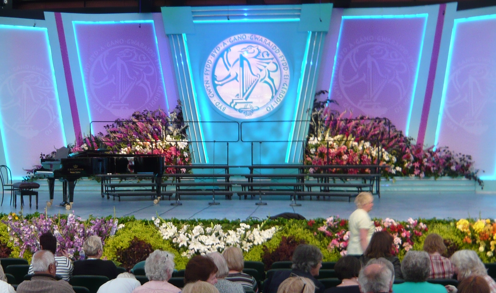Another example: one of the striking parts of the Eisteddfod's public face is the glorious display of flowers that frames the stage in the main Pavilion. You walk into that space, and you immediately feel special. If you go into one of the smaller local venues such as the Dinas Bran school or the Town Hall for a preliminary competition, though, you will also be greeted with a flower arrangement - not on the same scale, to be sure, but still more generous in scope than you usually come across at all but the most special occasions. There is a quiet message that even those who don't get to perform on the main stage also deserve to feel special.