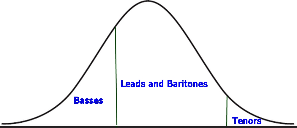 I’ve not actually seen concrete research documenting this, but it is clear through experience that a few people have unusually high or low voices, rather more have quite high/low voices, and a lot are kind of middling, perhaps tending a bit on the low side or a bit on the high side. So, whilst it is possible that the actual curve for vocal ranges might skew a bit one way or the other, it's going to be close enough to normal distribution for the classic curve to be useful for this analysis.