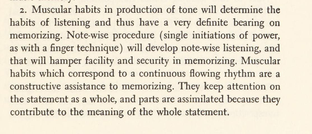 And then I read Abby Whiteside’s Indispensables in Piano Playing, which posits a directly causal relationship between physical and musical structures, mediated by how we listen to the music we are producing. The idea runs through the whole book; the following passage from the section on memorisation presents possibly the most succinct expression of it (p. 61):