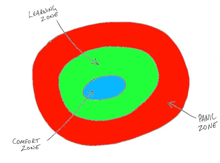Indeed, one of the clever things about Chris’s use of this model at the Directors College was the way it set up an agenda for adult learners at the start of the learning process. It primed participants to be challenged and to challenge themselves; in fact, it placed an obligation on participants to leave their comfort zones. But it also gave a shared vocabulary to holler for a lifeline when people shot over too near the panic-boundary.